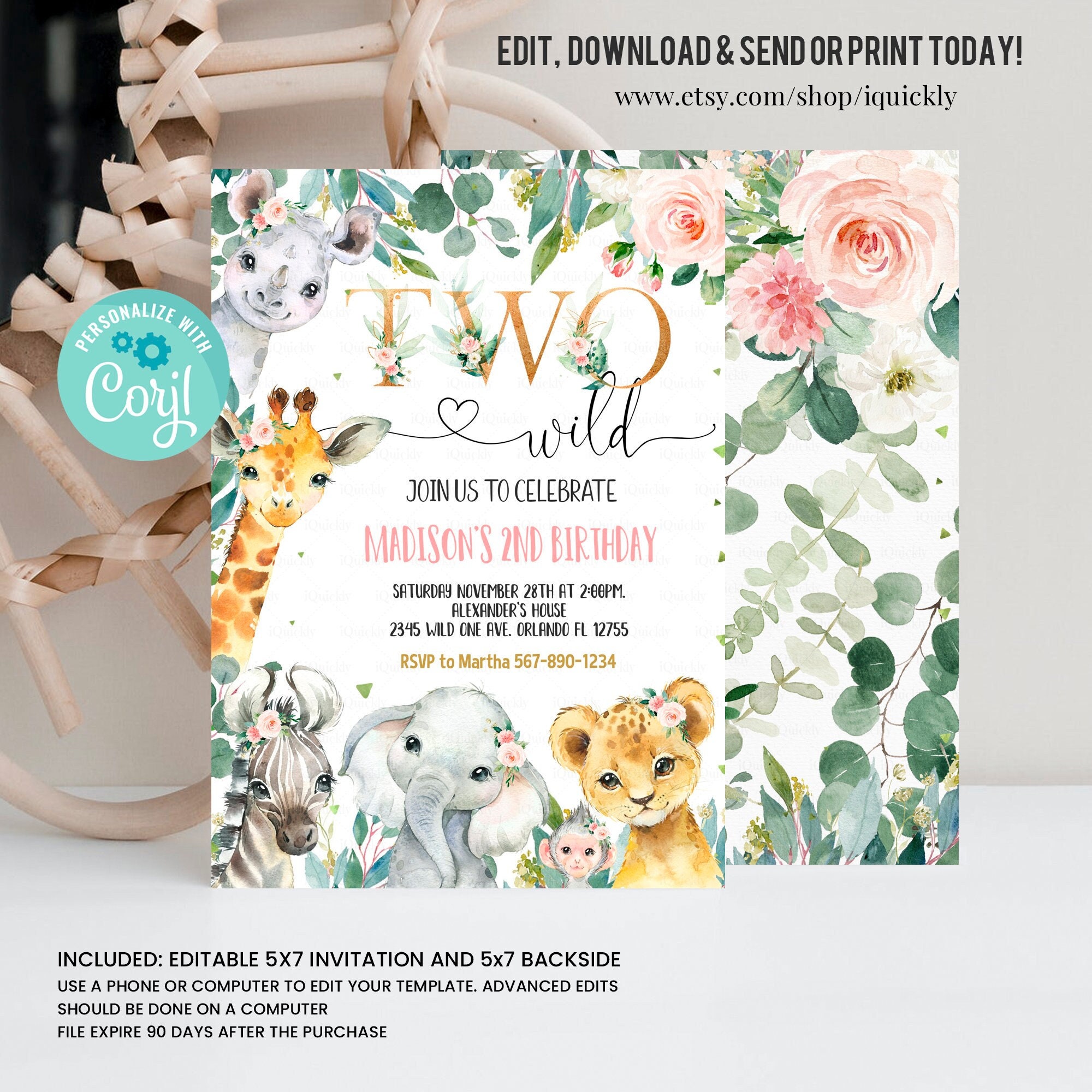 Editable Safari Birthday Invitation Girl Two Wild Birthday Etsy